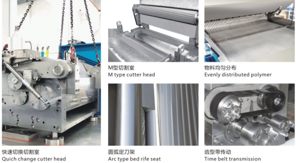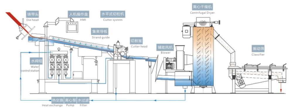 熔融物料經過鑄帶頭(模頭)分配,均勻形成多股膠條,在溢流水和噴淋水的冷卻下凝固結晶。膠條通過引料羅拉被引入切割室,在半凝固狀態下通過旋轉的回轉切刀切成所需規格的切片(切片規格可在線切換選擇)。切片在輸送冷卻水的作用下通過后續冷卻段進入離心式干燥機,在離心風機的輔助下脫除切片表面水份。干燥后的切片進入振動篩進行篩分,分理出超長切片和細小粉末。加長導槽設置可有效用于高粘度能冷卻是物料生產,同時增加冷卻長度使得切片成型更好,粒子更飽滿。